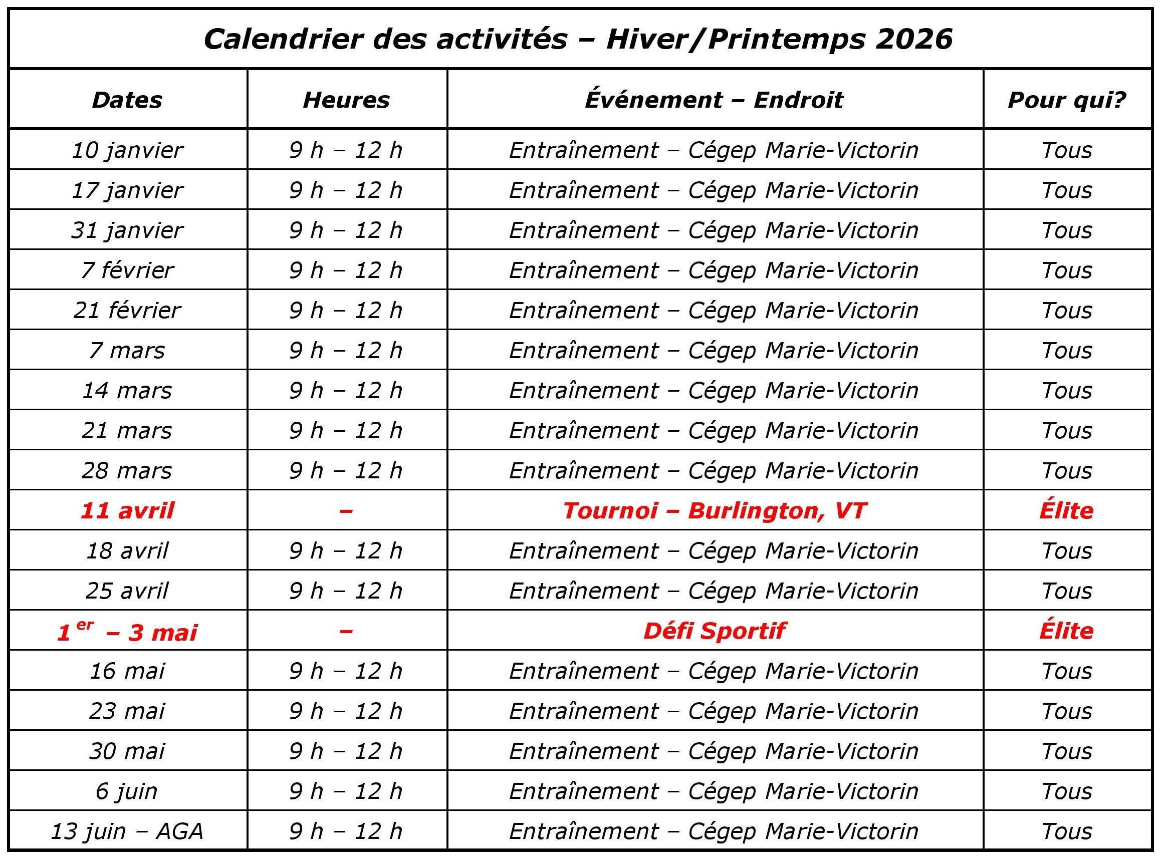 Calendrier des activités
